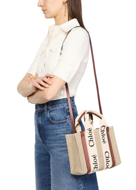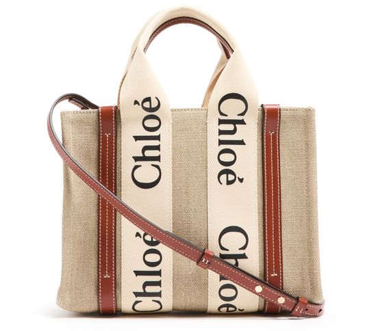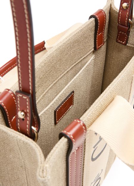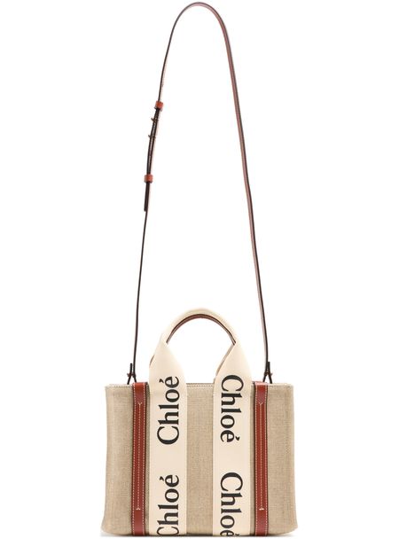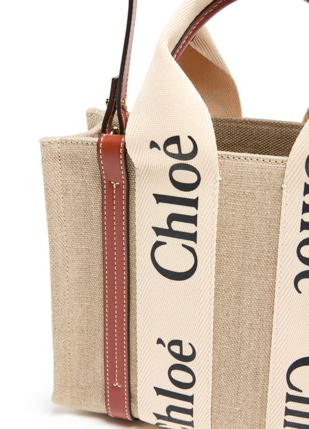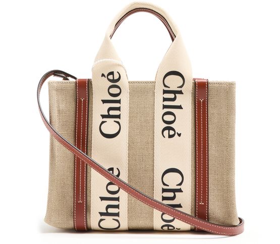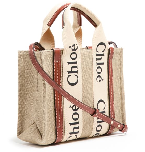 The Small Woody tote bag from Chloé features handles and a detachable strap for versatile carrying options. It is designed with Chloé lettering and an appliquéd logo, and has a single compartment with an interior patch pocket. The bag can be hand carried, worn on the shoulder, or as a crossbody with an adjustable shoulder strap. Height of handle: 11 cm and shoulder strap: 52...