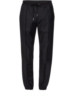 These jogging trousers are made of soft, supple and durable wool twill. They have an elasticated waistband with a metal tipped drawstring and zipped ankles. The front and back pleats add shape to your silhouette.