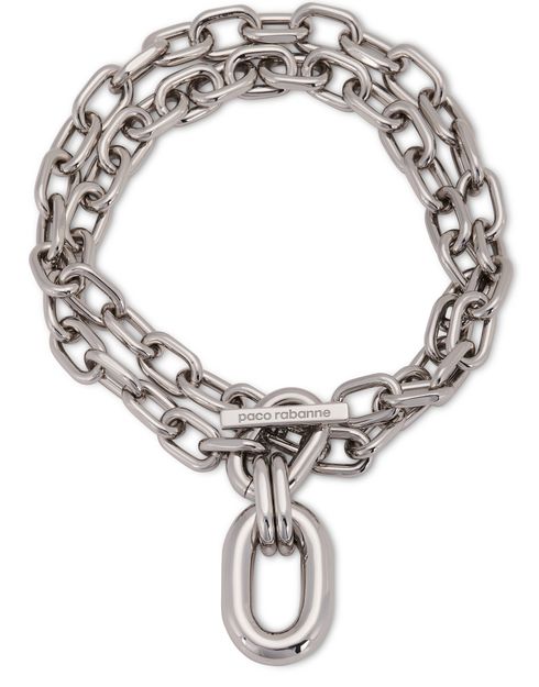 Paco Rabanne's XL Link necklace showcases a striking choker design, featuring a bold cable link chain that embodies modern elegance. With the engraving of the House, it reflects a rich heritage. The secure T clasp adds practicality, making this statement piece perfect for any occasion, blending style with sophistication effortlessly.