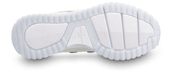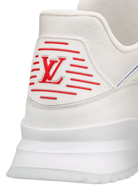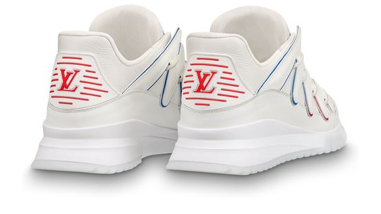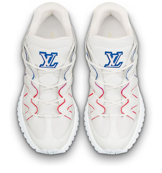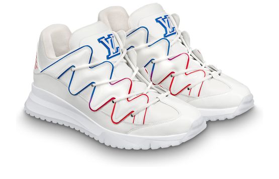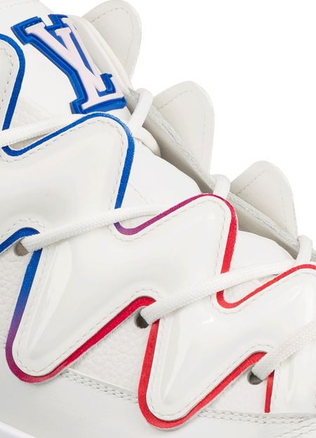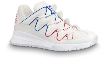 The Zig Zag sneaker contrasts the simplicity of white calf leather with an avant-garde chunky design. The distinctive zigzag patterns on its upper are highlighted by a thin line which shades from blue to red. This model features an LV Initials label on the tongue.