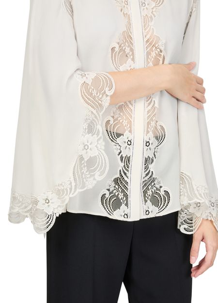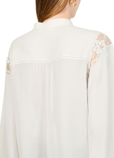 Découvrez la blouse à manches longues de chloe avec son encolure montante et ses manches cloche, ornée de broderie florale élégante. La fermeture à bouton ajoute une touche classique, parfait pour des occasions professionnelles comme décontractées.