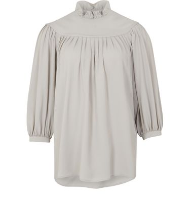La blouse fluide en crêpe de soie acétate de Celine évoque une élégance intemporelle. Son col montant à volants et sa fermeture délicate à l’arrière ajoutent une touche de sophistication. Les manches bouffantes trois-quarts et les fronces sous le plastron créent une silhouette confortable, tandis que les boutons nacrés aux poignets rehaussent le tout.