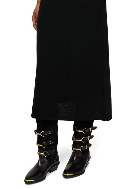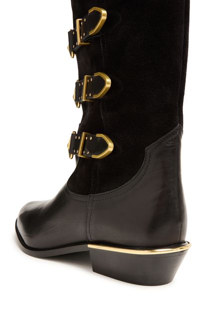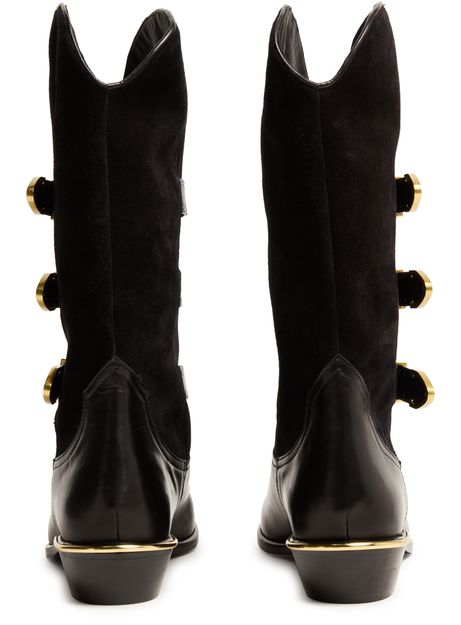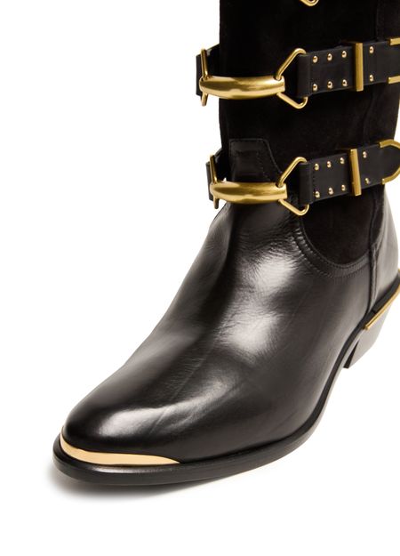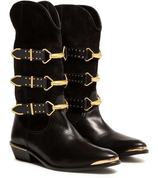 Découvrez les bottes style cowboy Mexia d'Isabel Marant, en cuir lisse avec petits talons blocs. Dotées d'un bout pointu et d'une bride à boucles, elles se distinguent par leur piqûre visible et leurs détails de clous. Les larges bretelles et les détails en métal à l'avant et l'arrière ajoutent une touche d'élégance.