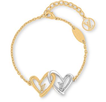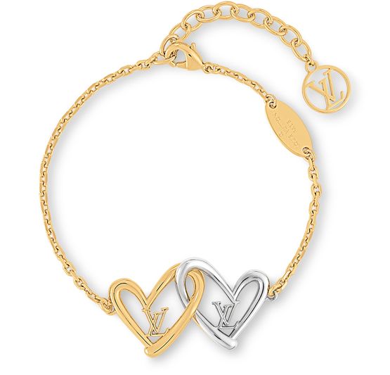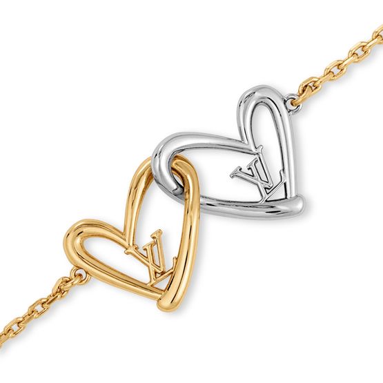 Le symbole de l'amour est interprété de façon ludique sur ce bracelet Fall in Love. Cette pièce ravissante présente deux cœurs creux entrelacés sur une chaîne qui révèlent des LV Initiales en leur centre. Il peut se porter seul ou associé aux boucles d'oreilles et au collier assortis pour adopter un look coordonné.