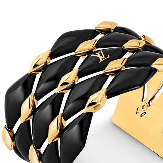 Ce bracelet LV Malletage revisite un motif distinctif inspiré des archives et rendu célèbre par les collections de maroquinerie de la Maison. Réalisés en métal brillant à finition noire et dorée, ses losanges évoquent le matelassage qui tapissait l'intérieur des malles historiques de Louis Vuitton. Ce bijou d'un raffinement extrême apporte une note d'opulence à toutes les silhouettes.