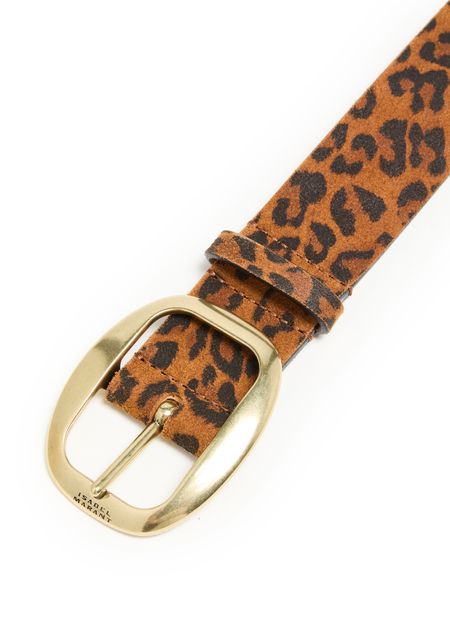 Découvrez la ceinture Dara d'Isabel Marant. Confectionnée en cuir velours, cette ceinture imprimé motif léopard est dotée d'un fermoir réglable et d'une boucle emblématique de la marque avec bouclerie en métal couleur or. Le logo en lettres dorées ajoute une touche d'élégance, idéale pour tous vos looks.