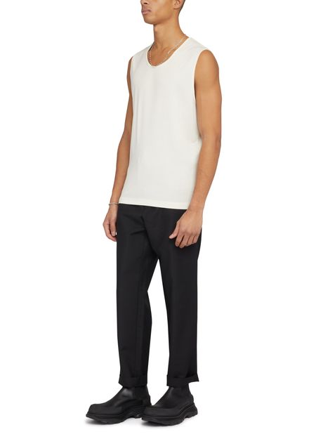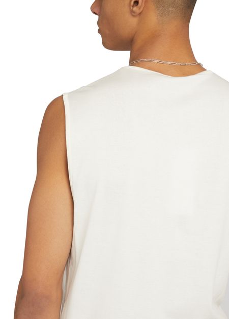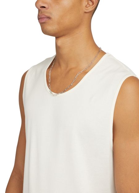 Le débardeur Lemaire, avec son haut sans manches et son encolure ras du cou, incarne la simplicité raffinée. Plus court à l'avant, il souligne délicatement la silhouette tout en offrant une liberté de mouvement. Parfait pour les journées ensoleillées, il se marie aisément avec un pantalon fluide pour une allure chic.