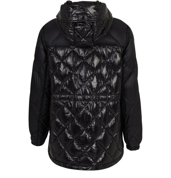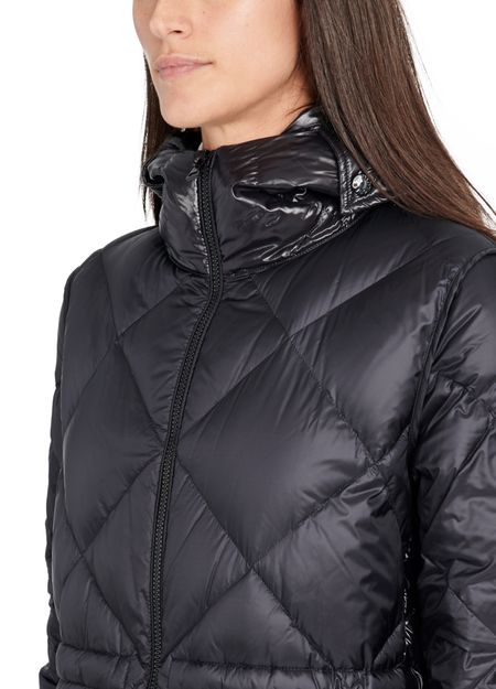 Description : Doudoune avec capuche, col montant, manches longues, texture matelassée, poignets resserrés, fermeture à glissière, coupe droite, taille ceinturée.