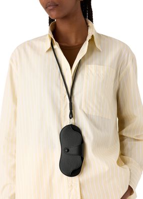 Découvrez l’étui à lunettes en cuir Valextra, confectionné en cuir grainé avec des finitions métalliques raffinées. Sa bandoulière fine amovible et ses coutures apparentes soulignent une allure contemporaine, tandis que la fermeture à boutons-pression assure praticité et élégance au quotidien.