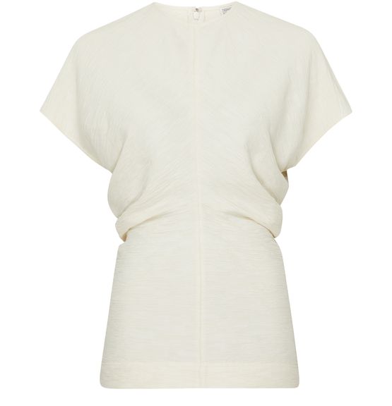 Le haut Toteme avec taille effet bouffant offre une silhouette classique et intemporelle. Sa fermeture à glissière dissimulée au dos assure une finition soignée. Les manches courtes et l’encolure ras du cou ajoutent une touche d'élégance, tandis que l'étiquette avec logo à l’arrière souligne l'identité de la marque.