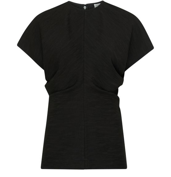 Le haut Toteme avec taille effet bouffant offre une silhouette classique et intemporelle. Sa fermeture à glissière dissimulée au dos assure une finition soignée. Les manches courtes et l’encolure ras du cou ajoutent une touche d'élégance, tandis que l'étiquette avec logo à l’arrière souligne l'identité de la marque.