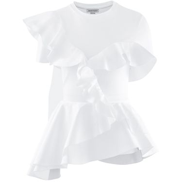 Cet audacieux vêtement asymétrique est une pièce à la féminité et à l'élégance indéniables. Les volants qui habillent ce haut en coton lui confèrent un profond romantisme signé Alexander McQueen.