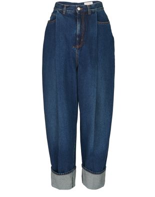 Alexander McQueen crée pour la femme moderne une silhouette ample et graphique avec ce jean audacieux. La maison revisite l'emblématique cinq poches dans un style très contemporain.