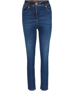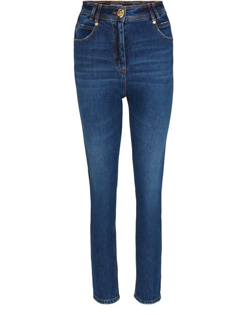 Description : Pantalon coupe slim, bouton griffé sur le devant, coutures contrastantes, style cinq poches, passants pour ceinture, logo à l'arrière, finitions métalliques dorées.