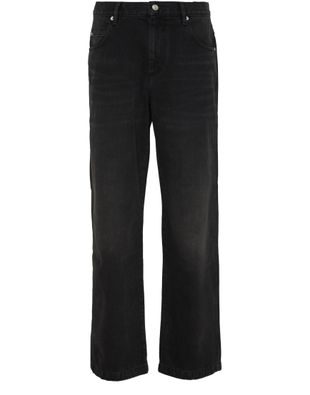 Description : fermeture bouton et à glissière dissimulée, passants pour ceinture, étiquette avec logo à l’arrière, visible, longueur sous le genou, style cinq poches.