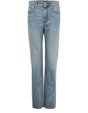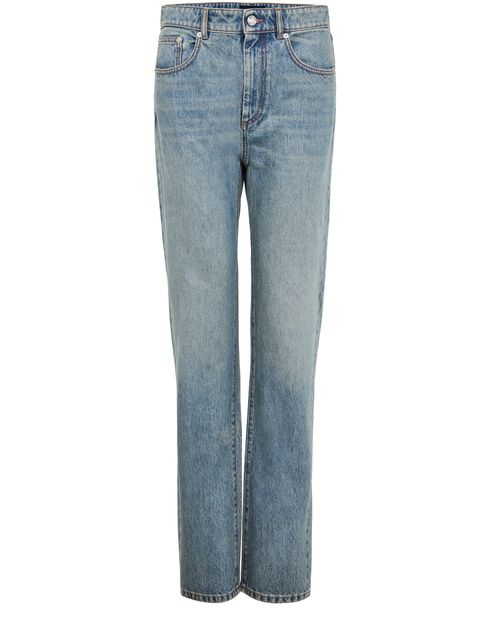 Description : fermeture bouton et à glissière dissimulée, passants pour ceinture, logo appliqué, étiquette en cuir à l’arrière avec logo, surpiqûre visible, longueur cheville, style cinq poches, denim, coupe droite, modèle taille basse.