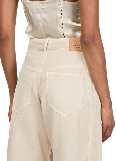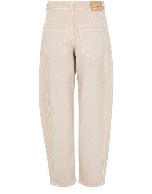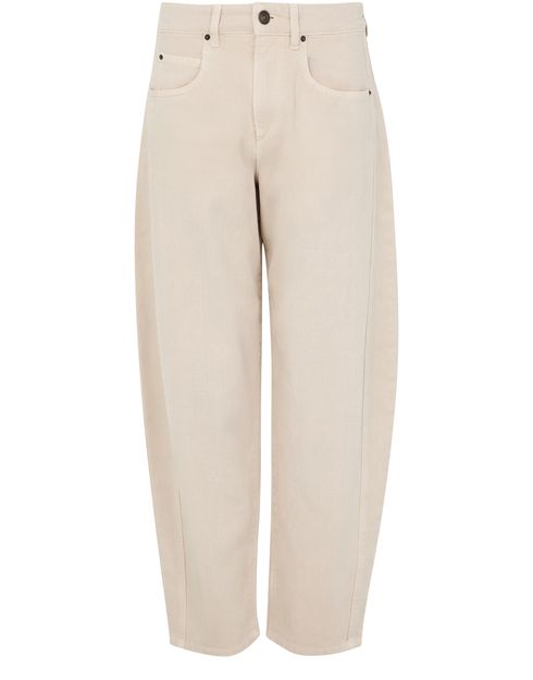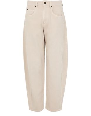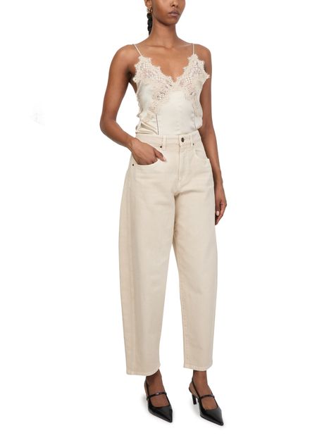 Découvrez le Jean Oriane d'Isabel Marant, doté d'une coupe barrel et d'une longueur cheville pour une silhouette élégante. Fermeture à glissière avec bouton, passants pour ceinture, poches avant et arrière, et surpiqûre visible. L'étiquette en cuir à l’arrière avec logo complète le tout.