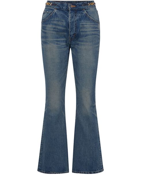 Les jeans flare Dylan de Celine incarnent l'élégance intemporelle. Avec une taille haute et une jambe évasée, ils sculptent la silhouette tout en offrant un confort inégalé. Les rivets sur la poche avant et les chaînes signature Triomphe ajoutent une touche distinctive, tandis que le zip et le bouton gravés témoignent d'un savoir-faire exceptionnel.