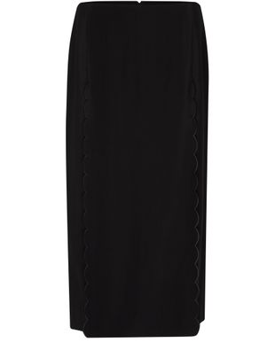 La jupe droite en viscose fluide de Chloé, ornée de festons brodés, évoque une élégance intemporelle. Sa fermeture à glissière au dos assure un ajustement parfait, tandis que sa longueur genou souligne délicatement la silhouette. Un choix raffiné pour celles qui recherchent à allier confort et style au quotidien.