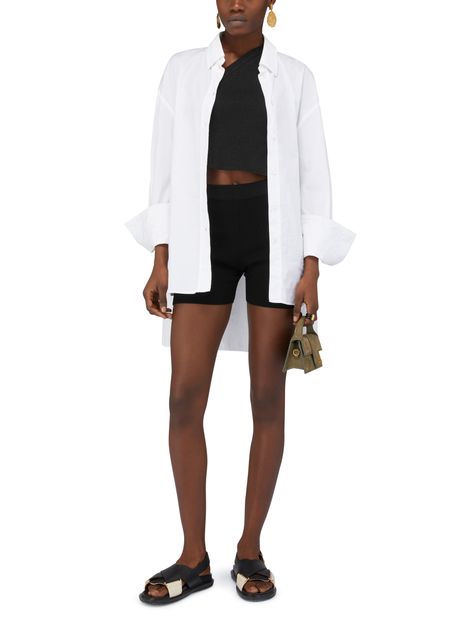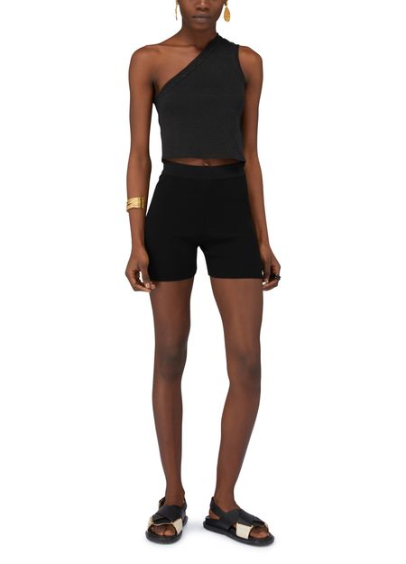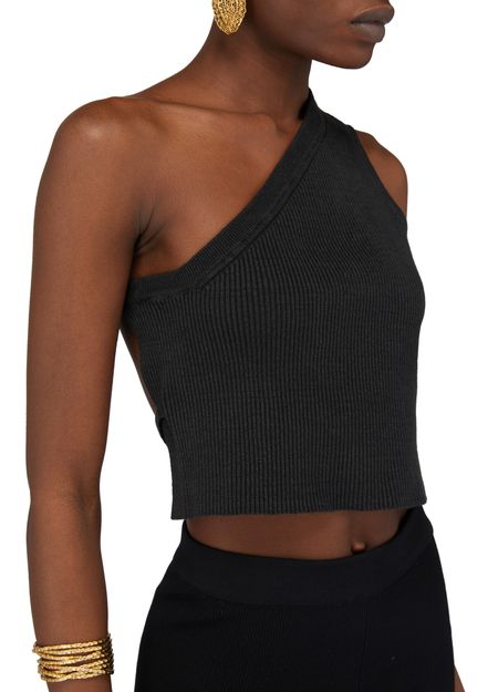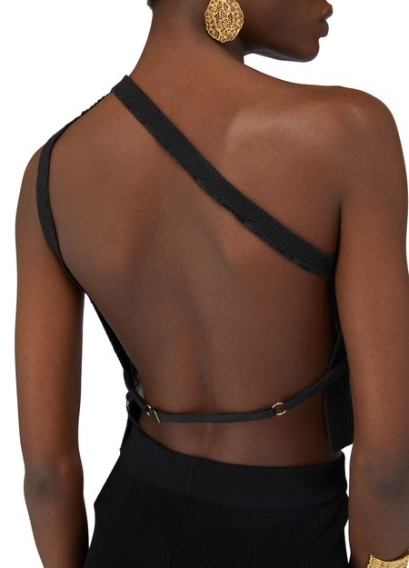 Le haut sans manches La Maille Ascu de chez Jacquemus présente une coupe asymétrique et ajustée, avec des bretelles et un dos nu. L'épaule dénudée ajoute une touche de sensualité à ce haut élégant et moderne.
