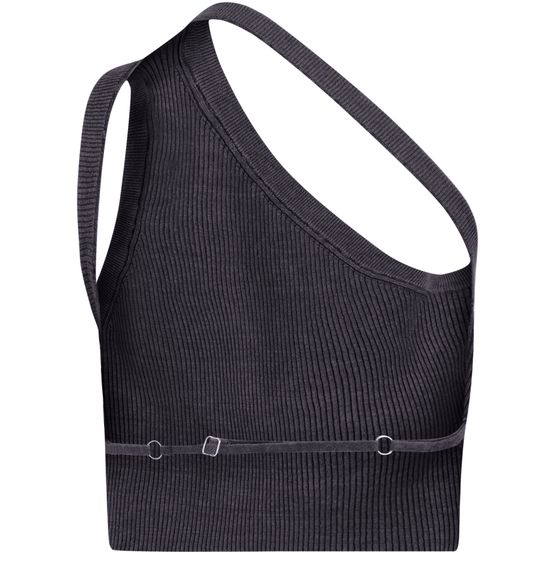 • Description : Haut sans manches, coupe asymétrique, coupe ajustée, bretelles, dos nu, épaule dénudée.