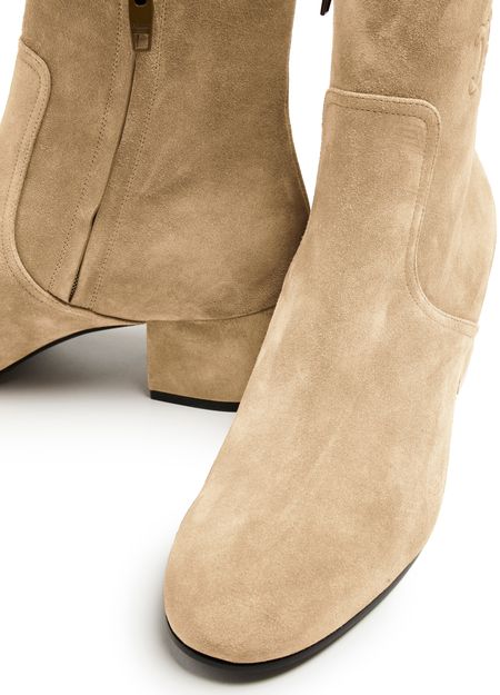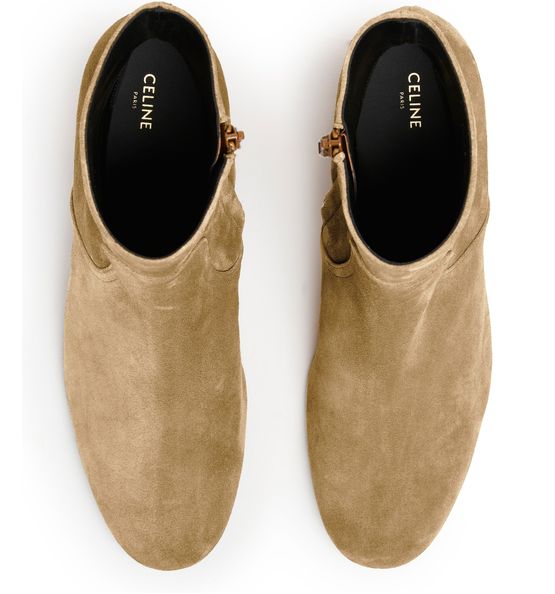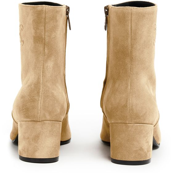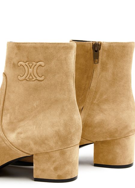 Les bottes Celine Triomphe zippées en cuir de veau velours allient élégance et confort. Leur tige haute et leur bout arrondi offrent une silhouette raffinée, tandis que le zip sur le côté facilite l'enfilage. La piqûre visible et le logo sur le côté ajoutent une touche distinctive, complétée par des petits talons et un talon bloc.