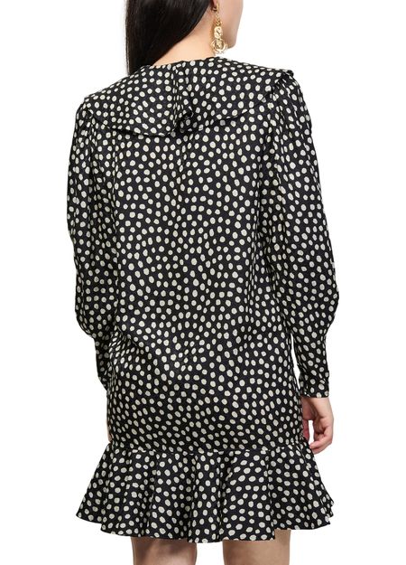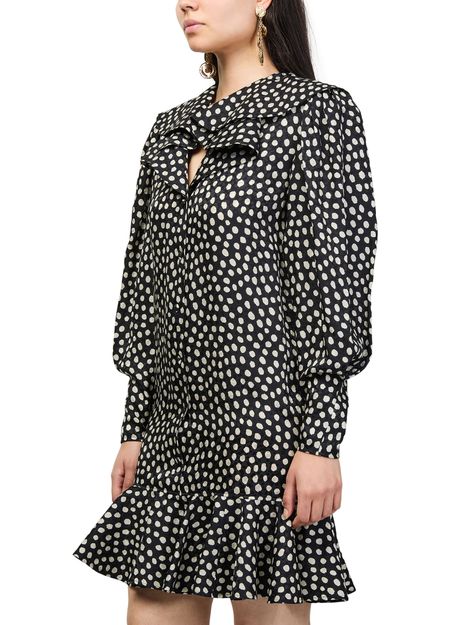 Découvrez la mini robe à volants de Chloe, longueur genou et motif à pois. Son col en V et col cape s’associent à des manches longues resserrées, tandis que les détails volants et la fermeture à bouton subliment la silhouette. Idéale pour toutes vos occasions élégantes.
