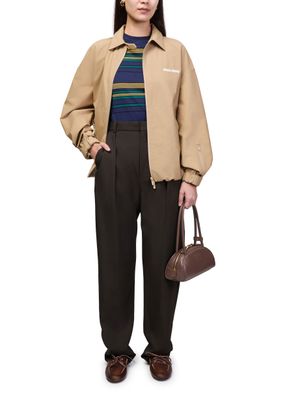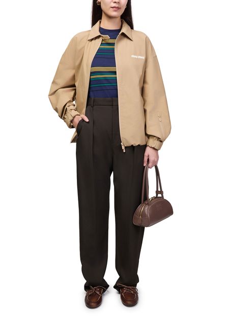 Découvrez le mini sac porté main bowling de Miu Miu, confectionné en cuir lisse avec finitions dorées. Le logo Miu Miu lettres estampées et les surpiqûres apparentes soulignent son allure raffinée. Poignée double, bandoulière fine et fermeture à glissière offrent une élégance fonctionnelle au quotidien.