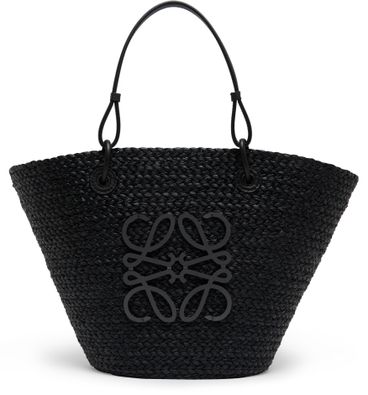Le sac panier Loewe Anagram en raphia et cuir de veau présente un logo appliqué à l'avant. Avec un compartiment unique, des poignées doubles et une bandoulière fine, il peut être porté à la main ou sur l'épaule pour un look chic et pratique au quotidien.