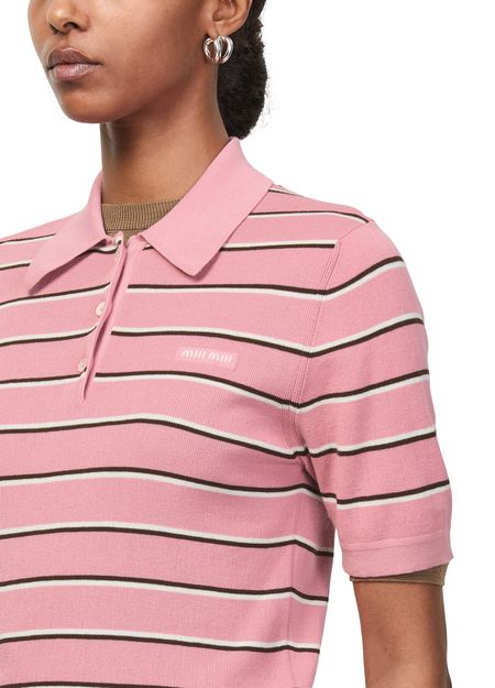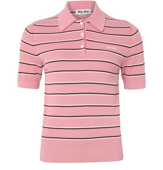 Découvrez le polo à rayures de Miu Miu, doté de manches courtes et d'une fermeture à bouton pour une allure élégante. Le logo brodé "Miu Miu" sur la poitrine sublime ce modèle, tandis que l’imprimé rayures apporte une note contemporaine à ce haut polyvalent.