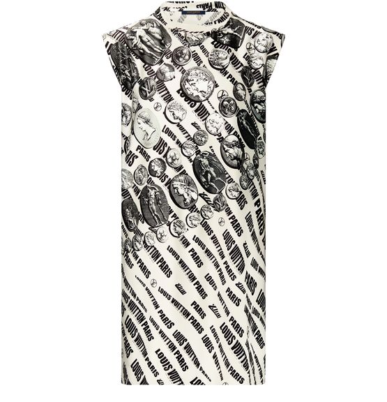 Incontournable du défilé, cette robe tee-shirt courte sans manches est sublimée par un imprimé graphique issu de la collaboration avec Fornasetti. Le motif signature continu de la saison l'inscrit dans un esprit à la fois rétro et ludique, tandis que les imprimés pièces et camées rappellent le thème de l'Antiquité gréco-romaine de la collection. Une chaîne caractéristique signe le col de cette pièce en jersey...
