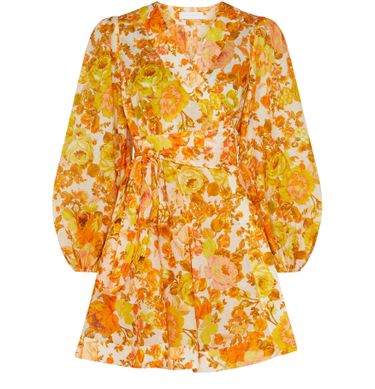La mini robe courte Devi de Zimmermann est une pièce élégante avec des manches longues et un col en V flatteur. Elle présente un charmant imprimé floral et un cache-cœur flatteur. Cette robe est dotée d'une ceinture amovible assortie qui souligne la taille pour une silhouette féminine. L'étiquette avec logo à l'arrière ajoute une touche subtile de branding.