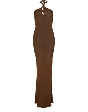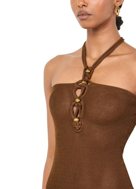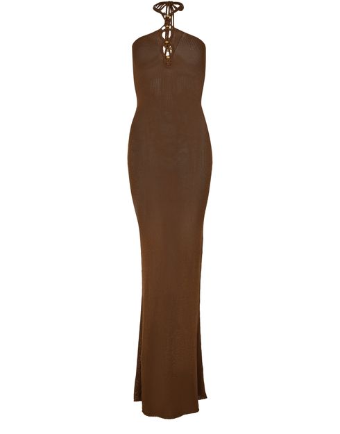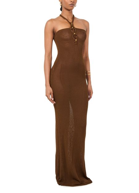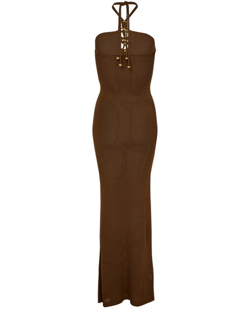 • Description : épaule dénudée, col ajustable avec cordon, surpiqûre visible, finitions dorées, soirée et cocktails, sans manches, logo appliqué, dos nu, robe longue, taille resserrée.