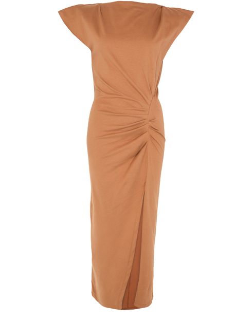 La robe longue Nadela d'Isabel Marant incarne l'élégance contemporaine. Son détail drapé sublime la silhouette, tandis que l'encolure ras du cou et les manches courtes offrent une allure raffinée. La fermeture à glissière dissimulée au dos et la surpiqûre visible ajoutent une touche d'originalité, mettant en valeur le logo appliqué.