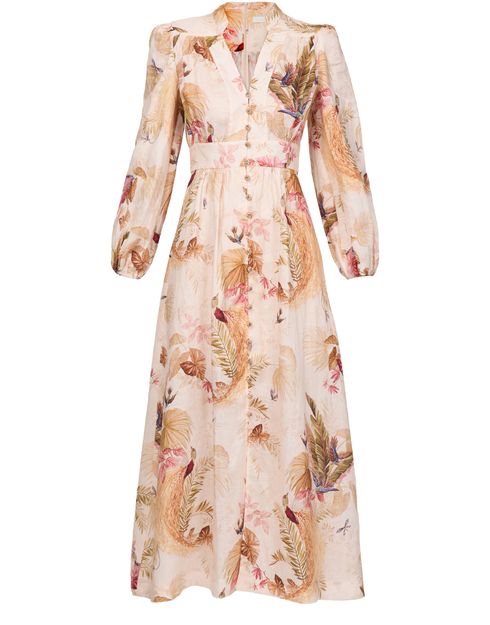 Découvrez la robe midi décolletée Ascension de Zimmermann, avec son imprimé floral enchanteur. Cette robe chemise présente une coupe ample, un col en V et des manches longues bouffantes. La fermeture à bouton recouvert du même tissu apporte une touche d'élégance, idéale pour toute occasion sophistiquée.