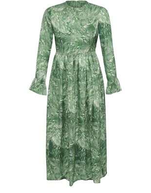 Cette robe midi est signée Roseanna. Cette pièce présente une coupe fluide. Elle est boostée par un tissu coloré et par des manches longues volantées.