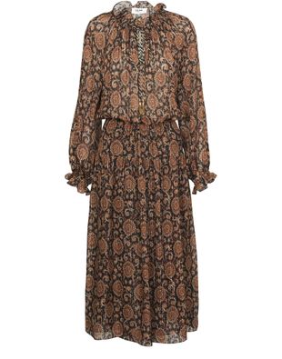 La maison française séduit les femmes modernes avec des articles raffinés et intemporels. Pièce du défilé Celine, la robe midi Folk propose une silhouette romantique, accentuée par ses volants au col et aux manches. Hedi Slimane signe cette création au look bohème affirmé avec des imprimés ethniques et un tombé fluide et délicat. Pour plus de style, elle peut être associée à des bottes montantes.