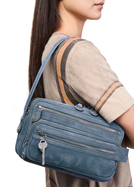 Découvrez le sac porté épaule Camero de Acne Studios, confectionné en cuir velours raffiné. Sa poignée unique, ses coutures apparentes et son logo à l'avant s’associent à des finitions argentées et une poche avant zippée pour une allure contemporaine et fonctionnelle au quotidien.