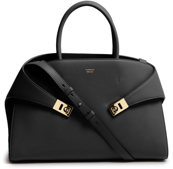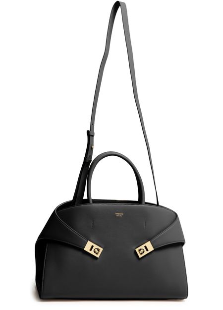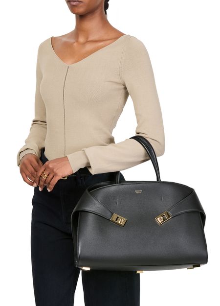 Découvrez le sac à main Hug (L) de Ferragamo, une pièce d'élégance et de fonctionnalité. Confectionné en cuir, ce sac porté épaule présente une fermeture pivotante et un logo métallique à l'avant. La bandoulière ajustable et amovible et le grand compartiment intérieur offrent polyvalence et espace pour vos essentiels.