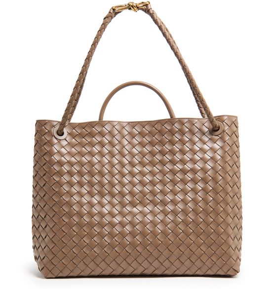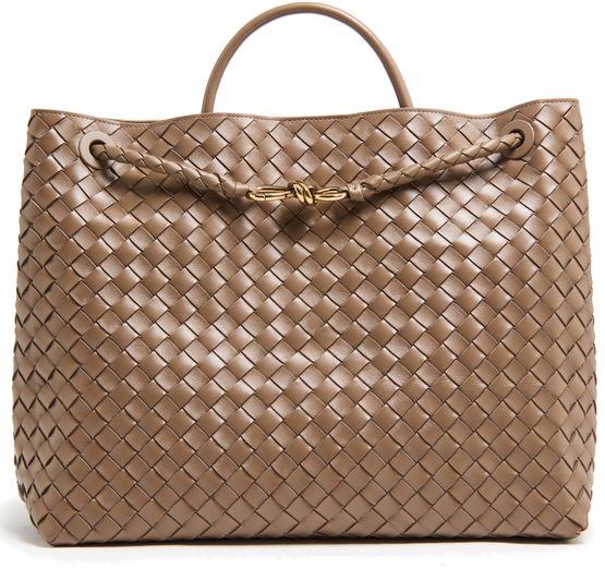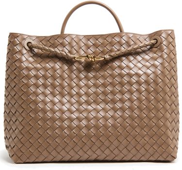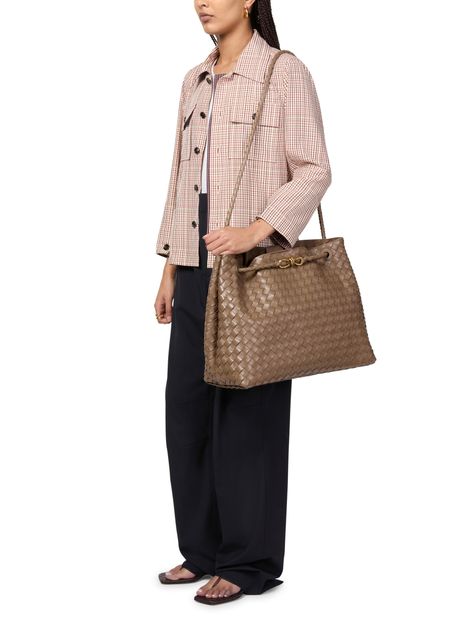Le grand sac Andiamo incarne l'élégance. Confectionné en cuir lisse, il se distingue par sa technique de tressage Intrecciato raffinée. Ses poignées confortables et ses finitions métalliques brillantes ajoutent une touche de luxe, tandis que son porté main offre une silhouette chic et moderne pour chaque occasion.