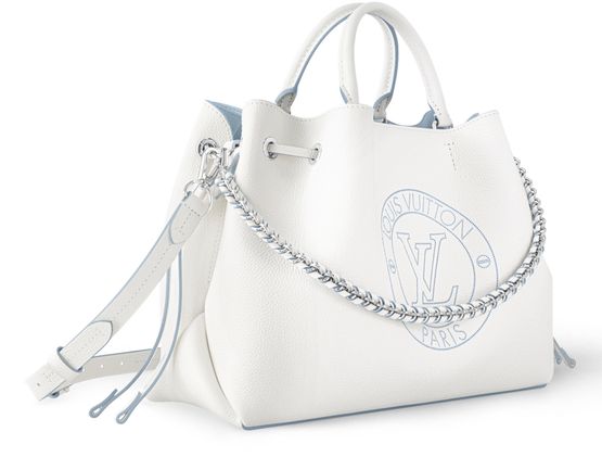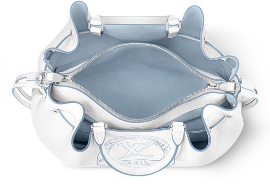 Issu de la collection Aura, ce sac cabas Bella spacieux se compose de cuir de veau perforé Mahina, habillé d'un coloris bleu et blanc lumineux. Le motif LV Circle rappelle le style classique de la Maison, tandis que la chaîne amovible en métal argenté ajoute une sophistication décontractée à ce modèle. L'intérieur spacieux dispose de deux compartiments séparés par une poche à fermeture à glissière.