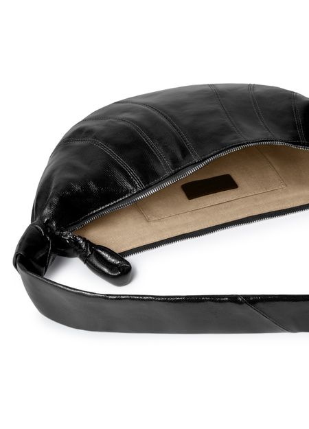 Le sac moyen Croissant se distingue par ses surpiqûres apparentes et son logo appliqué. Avec une fermeture à glissière, il offre un compartiment unique, parfait pour un mini sac. Sa poignée unique et sa bandoulière large permettent un porté main ou épaule, alliant élégance et praticité au quotidien.