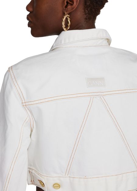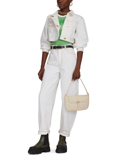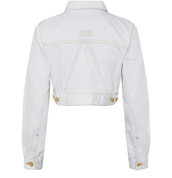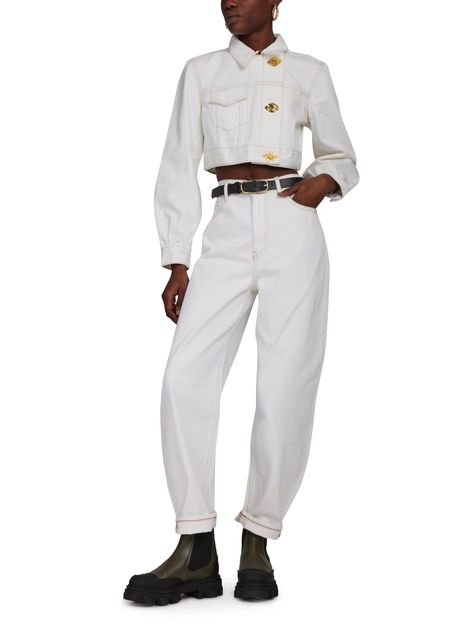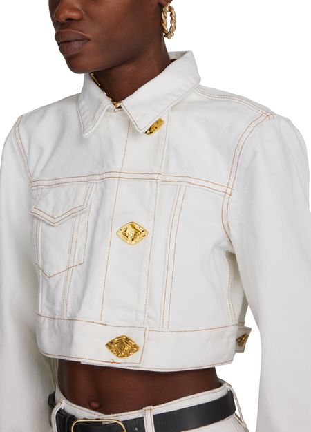 La veste en jean Ganni est une pièce incontournable pour une tenue décontractée et tendance. Sa coupe asymétrique et son col chemise lui donnent une allure moderne. Les manches longues avec poignets resserrés et les coutures contrastantes ajoutent une touche d'originalité. La poche à rabat et les finitions dorées apportent une touche sophistiquée.
