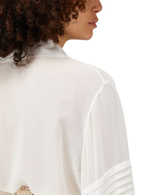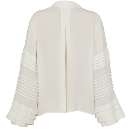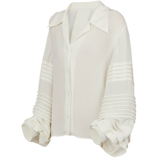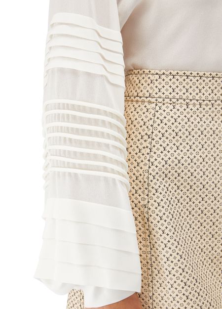 Cette blouse boutonnée démontre l'attention particulière portée à l'élaboration des manches. Nicolas Ghesquière magnifie ses manches oversize à grand renfort de plis et d'inserts en corde. Un tissu en georgette de soie offre du poids et du volume. L'ensemble atteste du savoir-faire artisanal exceptionnel signé Louis Vuitton.