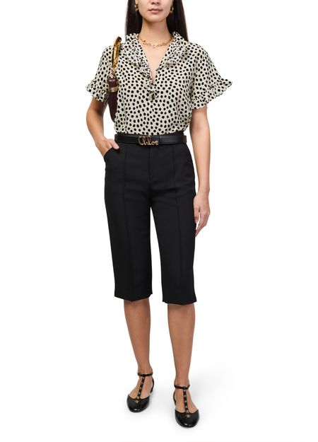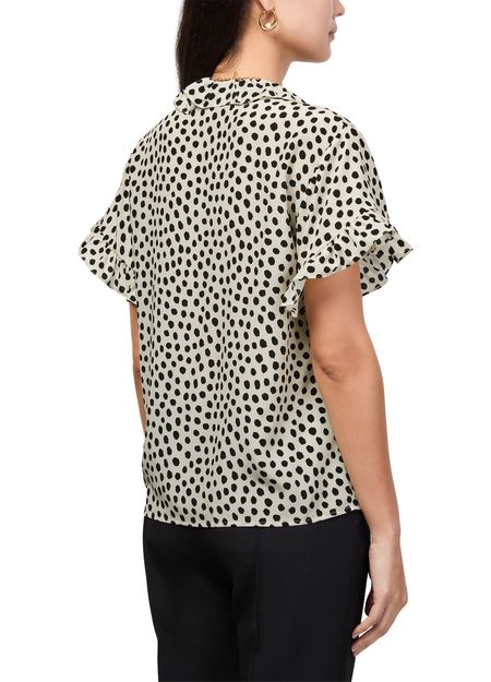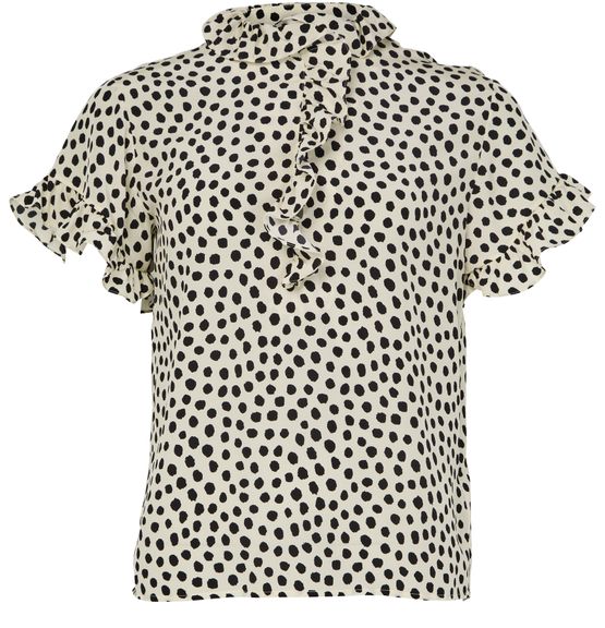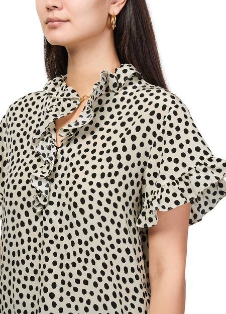 Découvrez la blouse imprimée Chloe, dotée d'une encolure montante et de manches à volants courtes. Son motif à pois offre une allure raffinée, idéale pour sublimer vos tenues du quotidien comme vos looks plus habillés.