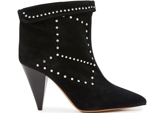 Avec ces bottines Lisbo à talons, Isabel Marant offre une relecture des années 80, qu'elle pimente de sa signature bohème. Les petits clous argentés éclairent le velours de veau noir et rehaussent le modèle d'une note rock et urbaine. On révèle ces bottines avec une jupe trapèze, un top imprimé et un blouson en cuir.