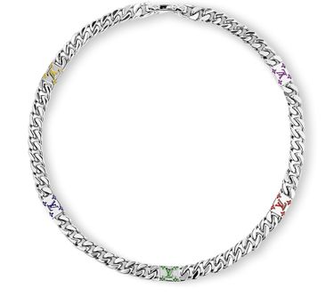 Ce collier LV Mosaic finement ouvragé associe les maillons entrelacés Tied Up de la Maison à une chaîne cubaine. Les motifs LV Initiales et Monogram en émail coloré ponctuent la pièce d'une élégance ludique. Bijou contemporain convenant à toute garde-robe masculine, ce modèle fait partie d'une collection qui comprend un bracelet assorti et un ensemble de bagues aux teintes vives.