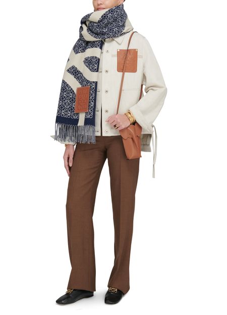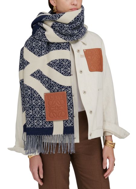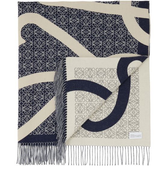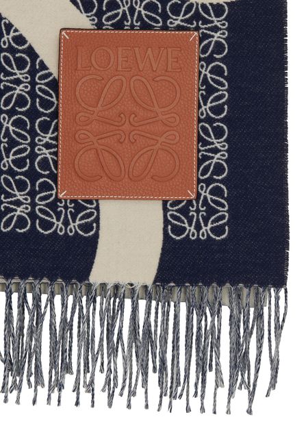 Des bords effrangés et une étiquette à logo embossé font de la couverture Anagram un must des dressings de l'hiver. Le graphisme du motif capte le regard et habille la silhouette de ses arabesques chères à Loewe.