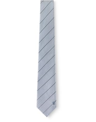 Cette cravate Écu en soie brillante associe des carreaux Petit Damier à des bandes étroites contrastées. Elle est ornée des LV Initiales placées à l'intérieur d'un blason.