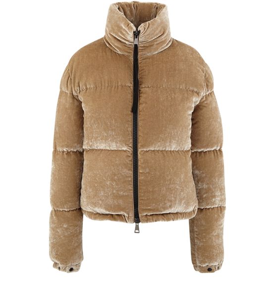 Avec la doudoune en velours Rimac, Moncler sublime les lignes sportwear d'un vêtement de saison par la délicatesse d'une matière raffinée au coloris sobre et féminin.
